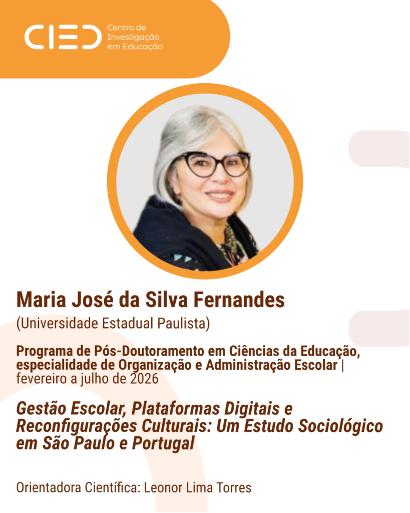 Maria José da Silva Fernandes, da Universidade Estadual Paulista, está a frequentar o Programa de Pós-Doutoramento em Ciências da Educação, especialidade de Organização e Administração Escolar, no Instituto de Educação da Universidade do Minho, no período compreendido entre 1 de fevereiro e 31 de julho de 2026, desenvolvendo o projeto intitulado “Gestão Escolar, Plataformas Digitais e Reconfigurações Culturais: Um Estudo Sociológico em São Paulo e Portugal”, sob orientação da Investigadora CIEd Leonor Lima Torres.